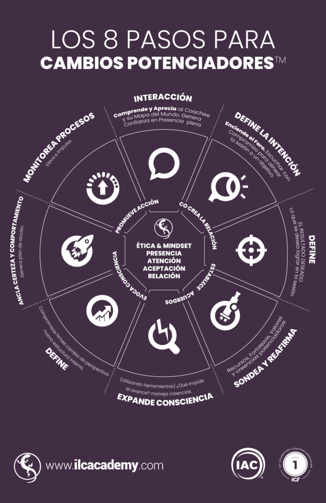 A continuación presento un esquema de los 8 PAsos para cambios potenciadores la cual se monta sobre las COmpetencias ICF y las Maestrías IAC.